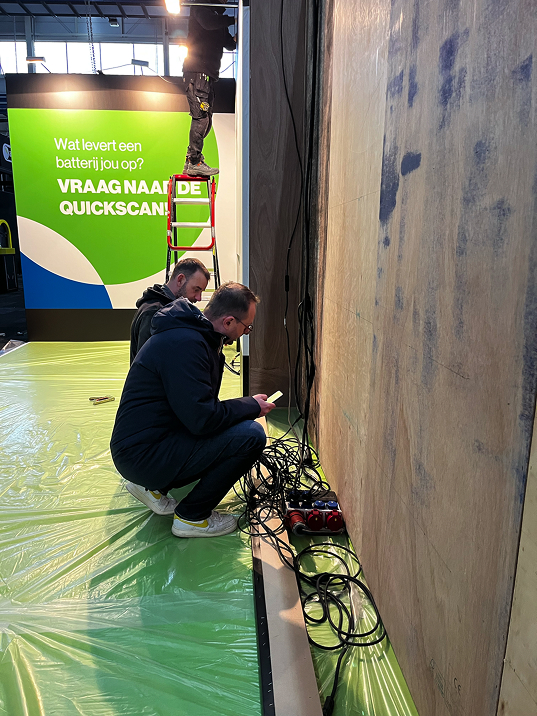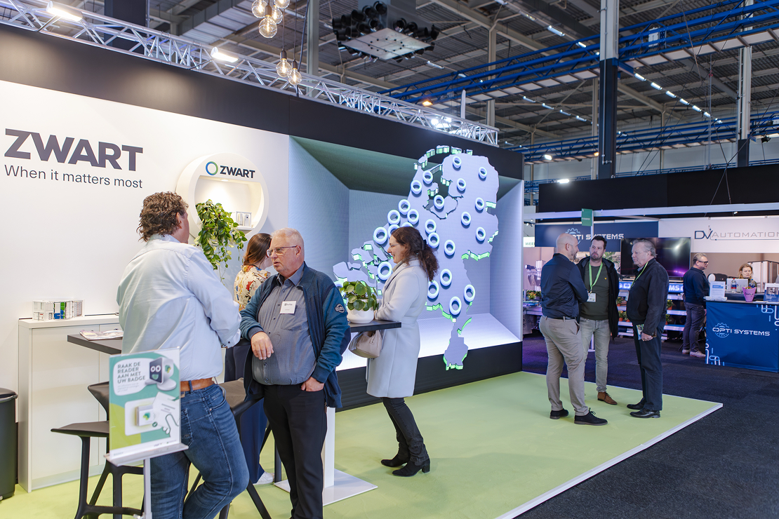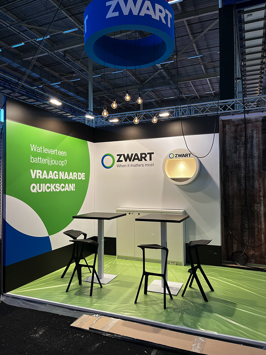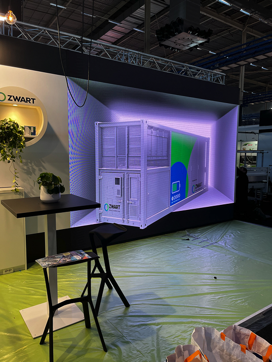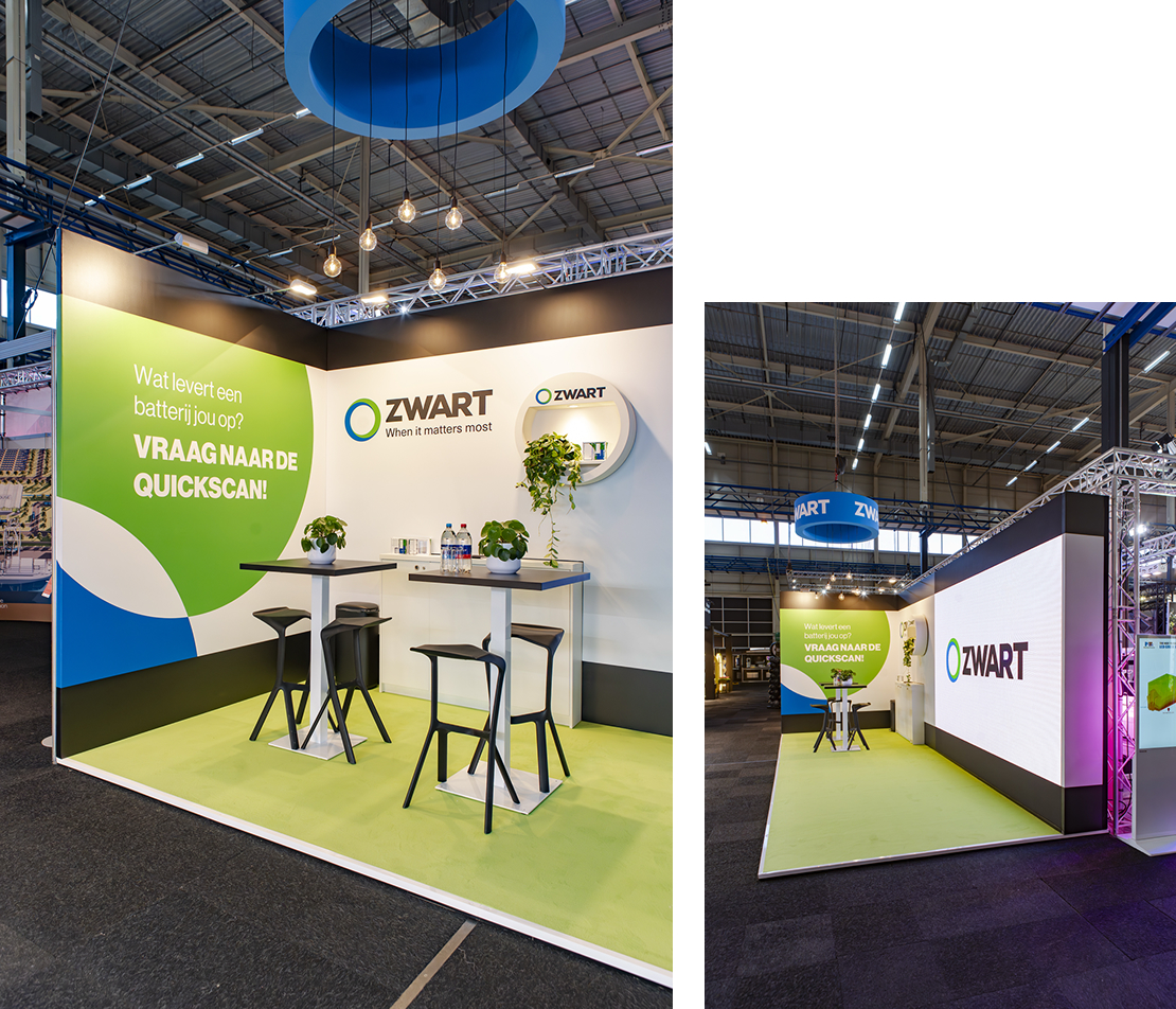 Het concept draaide om een 4×3 meter LED-wall die als start- en eindscherm de branding van Zwart toonde. Door een animatie te maken waarbij het scherm optisch naar achter bewoog ontstond het effect van een ‘holle box’. Binnen deze ruimte kwamen alle elementen tot leven: de batterijcontainer draaide rond, USP’s verschenen en de kaart van Nederland toonde Zwart-projecten. Door het gebruik van dit visuele trucje leek de stand groter en dynamischer, terwijl bezoekers letterlijk werden aangetrokken door de animatie. Het gehele proces versterkt de boodschap en laat de batterijoplossingen op een verrassende manier zien, zonder dat het publiek door de fysieke grootte wordt beperkt.